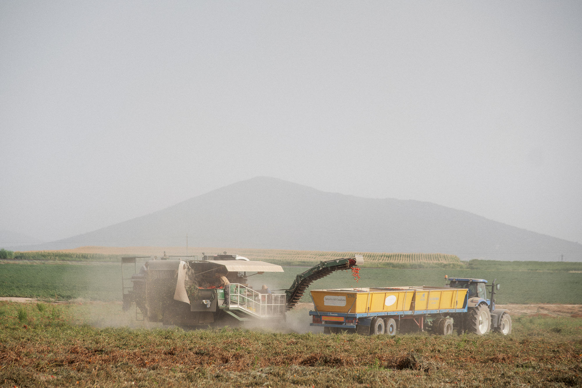 The harvesting machine cuts the plants just below the soil surface and separates the tomatoes from the plant. Three harvest workers and an optical sorting device remove unripe fruit, stones and clods of earth before the ripe tomatoes are conveyed by belts into trailers driving alongside.