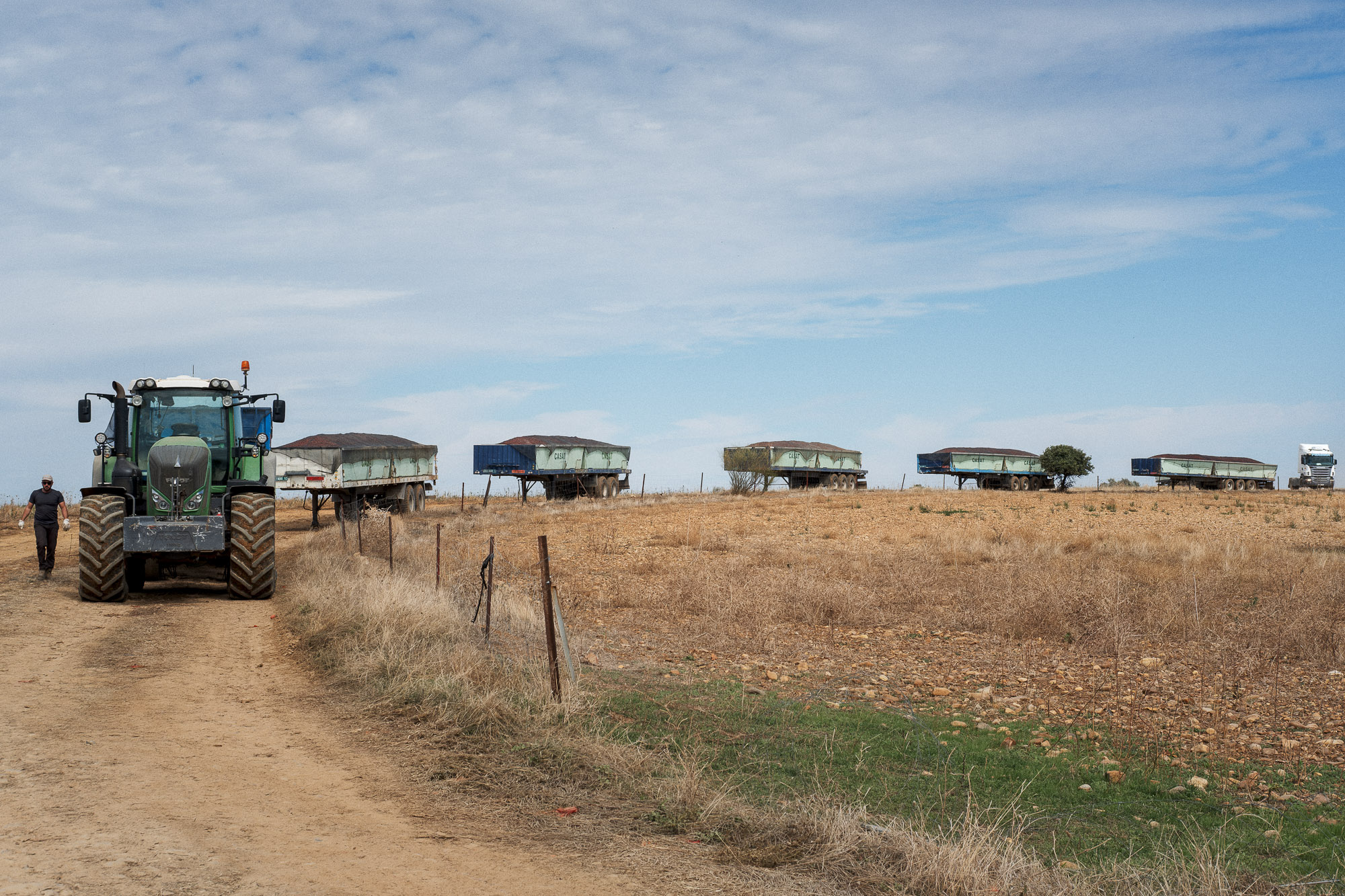 Gegend von Don Benito, Extremadura, Spanien. 28.9.2021. Fuenf Anhaenger, gefuellt mit je 10'000 kg maschinell geernteten Roma-Tomaten, stehen fuer den Transport in die Weiterverarbeitungszentren internationaler Lebensmittelkonzerne in Don Benito bereit. Diese Sorte eignet sich besonders fuer die Verarbeitung zu Sugo und wird in Konservendosen abgefuellt.
