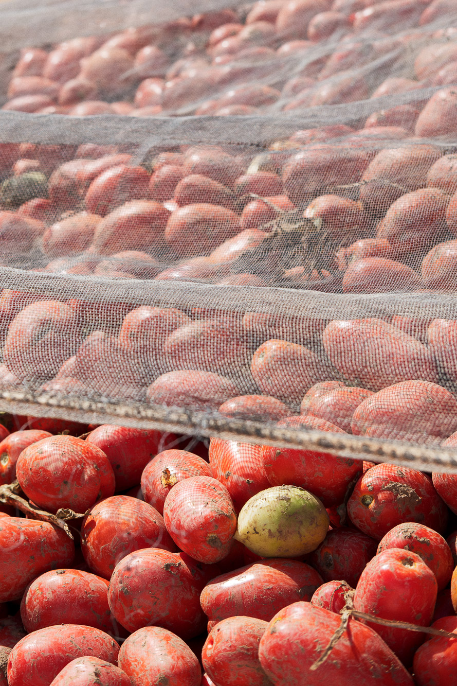 Gegend von Don Benito, Extremadura, Spanien. 28.9.2021. Anhaenger, gefuellt mit maschinell geernteten Roma-Tomaten, stehen fuer den Transport in die Weiterverarbeitungszentren internationaler Lebensmittelkonzerne in Don Benito bereit. Diese Sorte eignet sich besonders fuer die Verarbeitung zu Sugo und wird in Konservendosen abgefuellt.