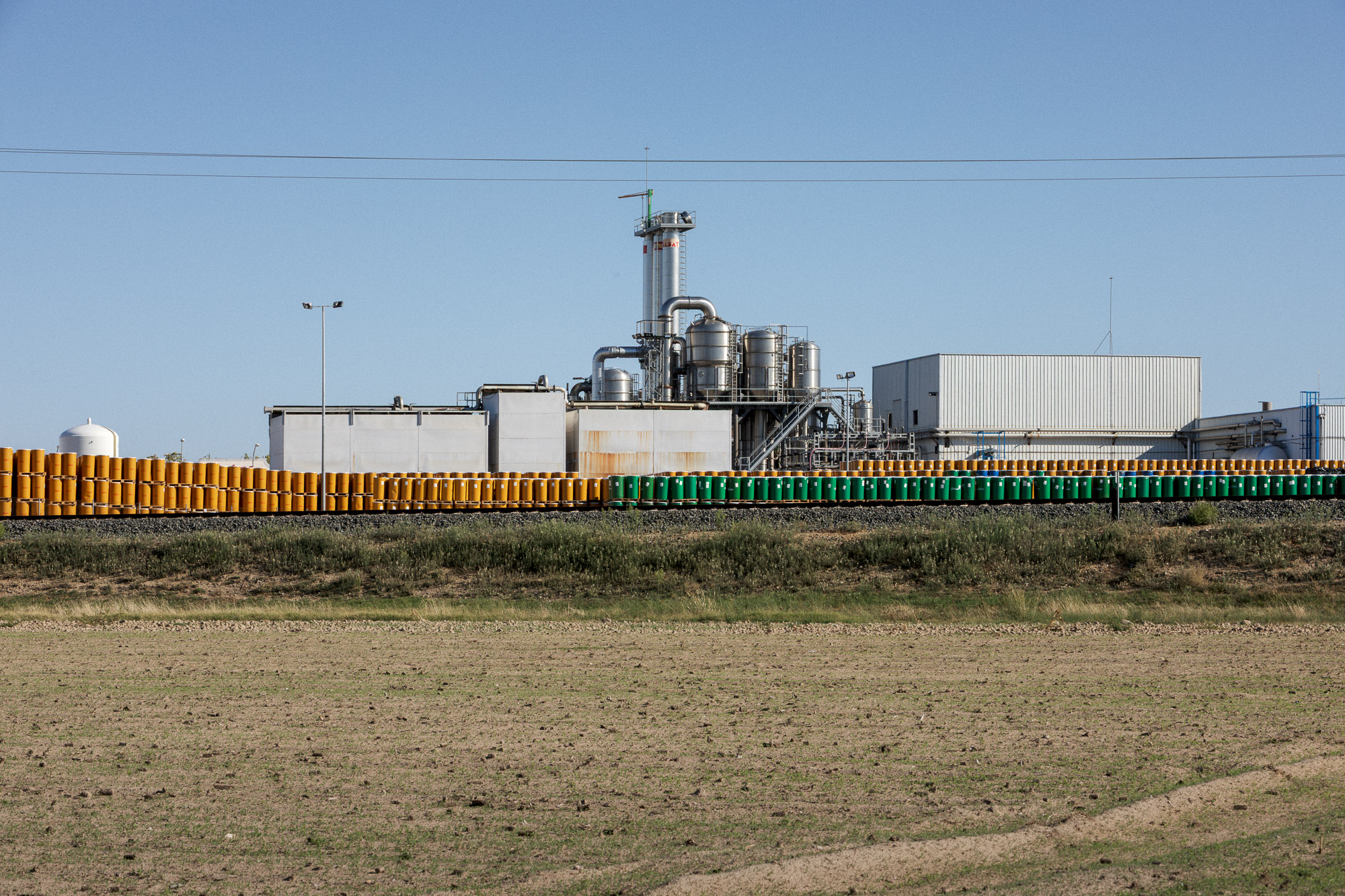 Don Benito, Extremadura, Spanien. 28.9.2021. Die Firma Alsat verarbeitet pro Saison 200’000 Tonnen Frischtomaten; mehr als 90 Prozent der Produktion werden exportiert. Nach der maschinellen Ernte werden die Tomaten direkt in solche Produktionszentren gebracht und sofort verarbeitet.