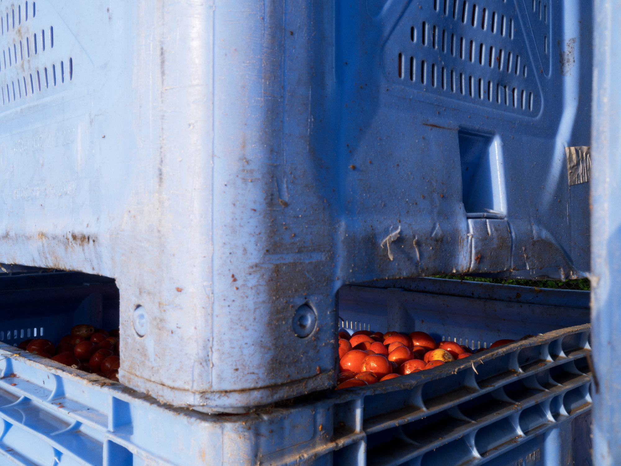 Silla, Valencia. Spanien. 27.8.2024. Bei Frutas y Verduras Massanassa werden 7 Lastwagen mit 120'000 kg Tomaten beladen fuer die Tomatina, die am naechsten Tag in Bunol stattfinden wird.