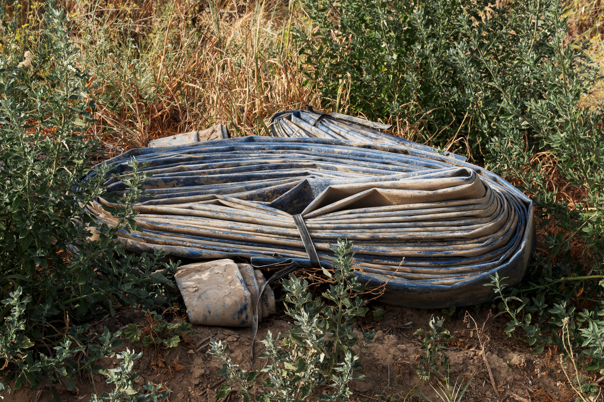 Medellin, Extremadura, Spanien. 11.8.2021. Aufgerollter Bewaesserungsschlauch nach der Tomatenernte. In der noerdlichen spanischen Autonomen Region Extremadura, die von zwei der groessten Fluesse des Landes durchquert wird, bilden Wasserreichtum und EU-Foerdergelder die Grundlage für eine industrialisierte Landwirtschaft, die vorwiegend für den Export produziert. Bereits die Roemer errichteten dort ein ausgekluegeltes Kanalsystem mit Aquaedukten.