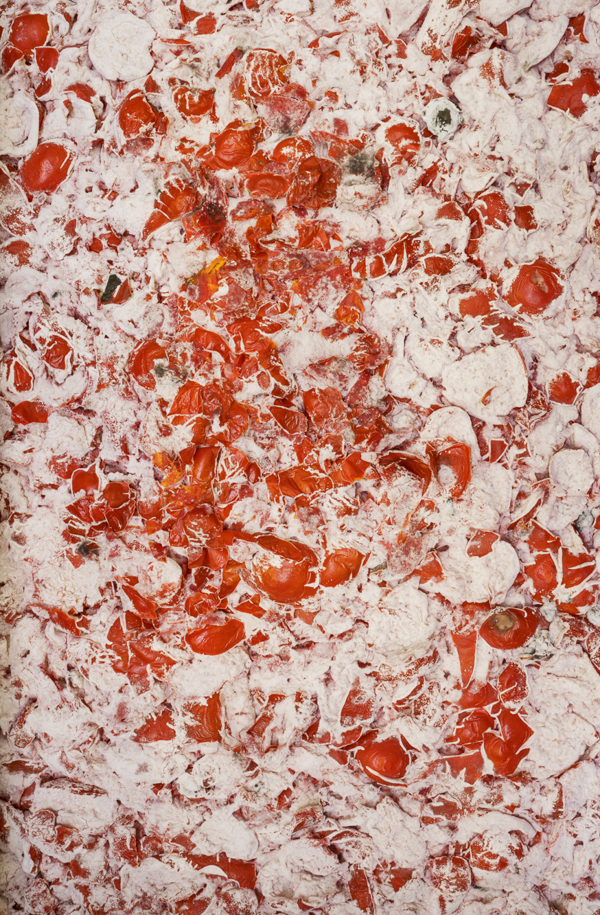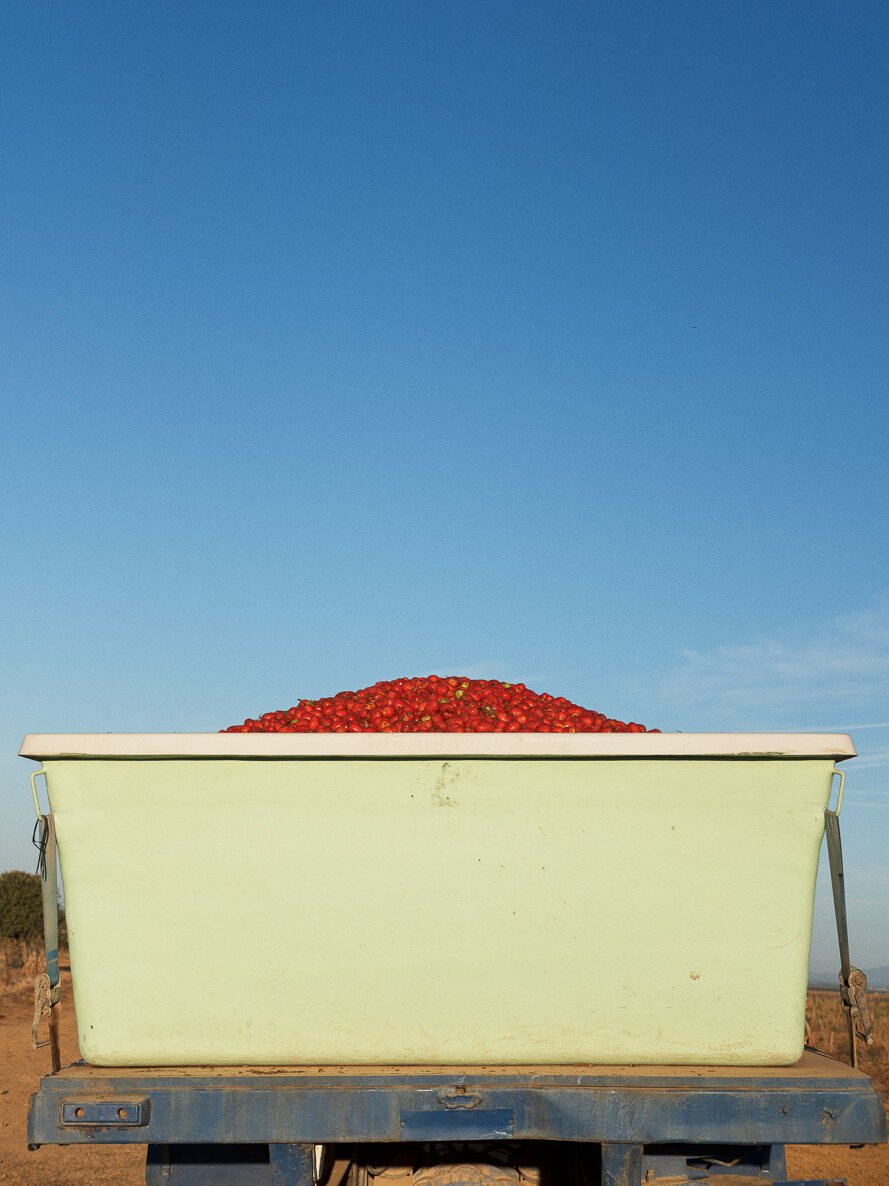 Daniel Rihs’ Fotografien klagen nicht an. Vielmehr wirft er mit «Tomato Travels» Licht auf die strukturelle Gewalt der globalen Nahrungsmittelproduktion. Zwischen den einzelnen Bildern entstehen Verbindungen, die Verborgenes zum Vorschein bringen, eine grössere Geschichte erzählen. Wenn wir auf den Fotografien Menschen erkennen, sind es keine Nahaufnahmen. Oft sind Körper zu erkennen: Nicht als Individuen, sondern als Elemente in dieser Nahrungskette, die Mensch und Natur gleichermassen an die Grenzen bringt – vom kostbaren Saatgut bis zur günstigen Pelatibüchse.