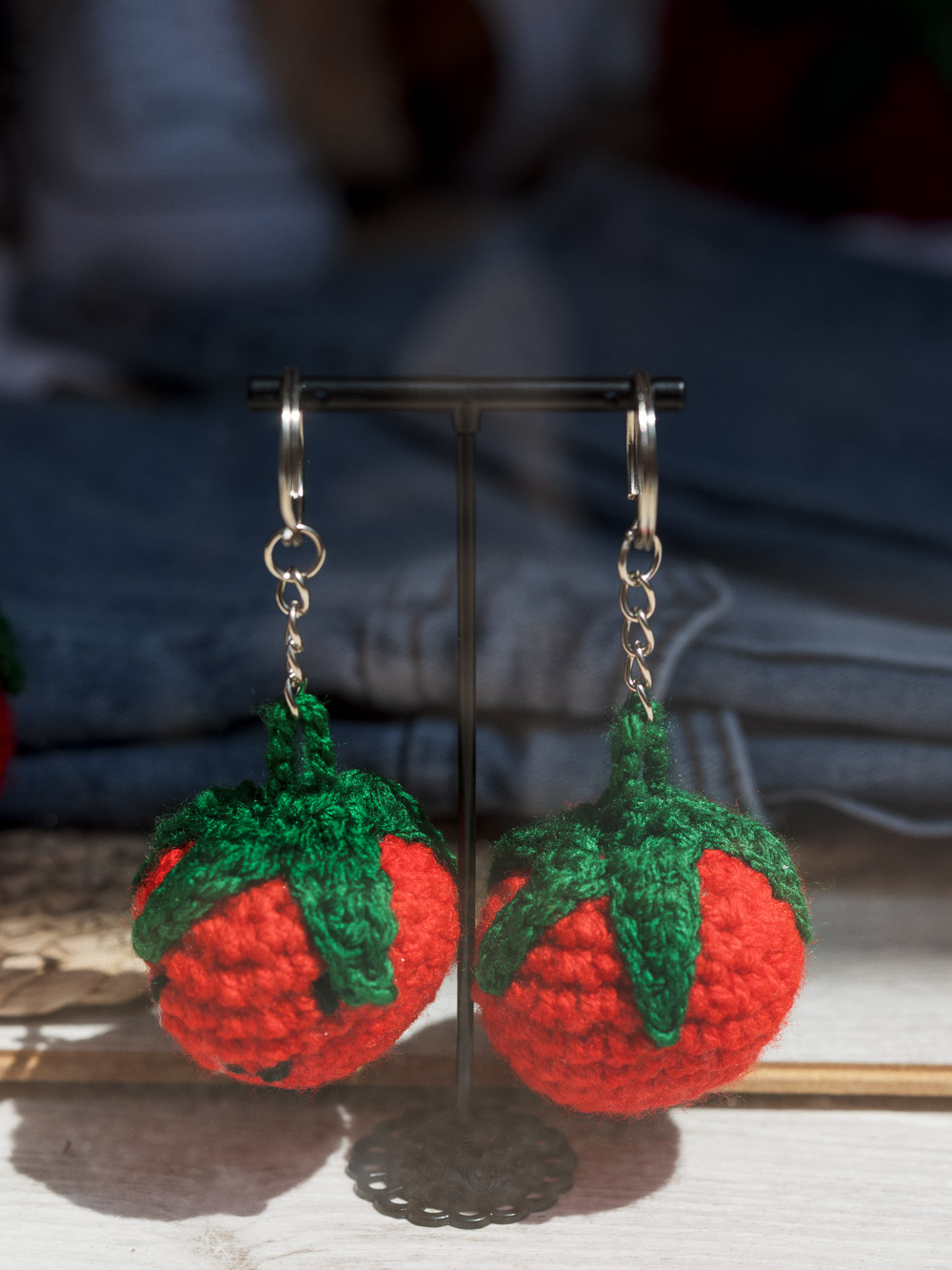 Bunol, Valencia. Spanien. 24.8.2024. Gehaekelte Tomaten sind in einem Schaufenster ausgestellt. An diesem Tag findet fuer Kinder eine kleine Tomatenschlacht statt, im Vorfeld der La Tomatina, der weltweit groessten Lebensmittelschlacht, die jedes Jahr am letzten Mittwoch im August ausgetragen wird.