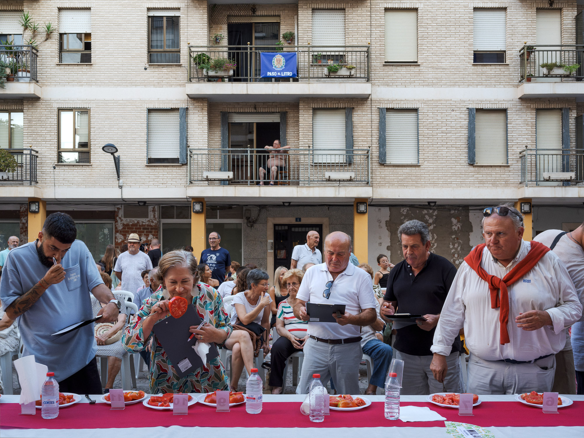 Bunol, Valencia. Spanien. 27.8.2024. Am Vorabend der Tomatina wird auf der Plaza Layana in Bunol, Spanien, beim Wettbewerb „El mejor tomate“ die beste Tomate lokaler Produzentinnen und Produzenten praemiert. Die Jury besteht aus Fachpersonen der Gastronomie.