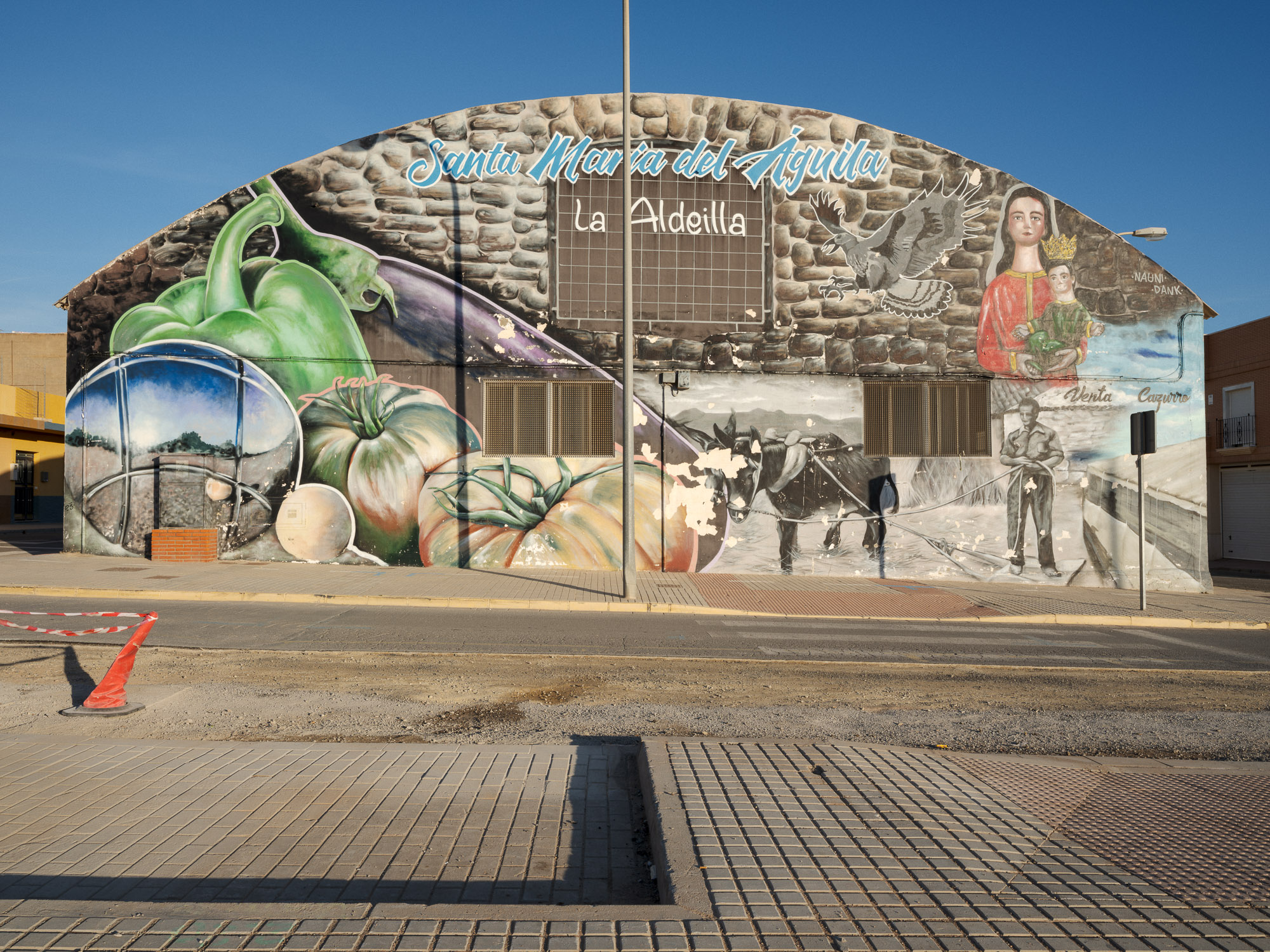 El Ejido, Almeria, Spanien. 11.11. 2025. Ein Wandbild am einem Kulturzentrum in die Geschichte des Ortes. Das von den lokalen Graffitikuenstlern gestaltete Mural verbindet Landwirtschaft, Reitsport, Boule und religioese sowie historische Motive, darunter die Schutzpatronin Maria Madre de la Iglesia und den historischen Wasserspeicher El Boque.