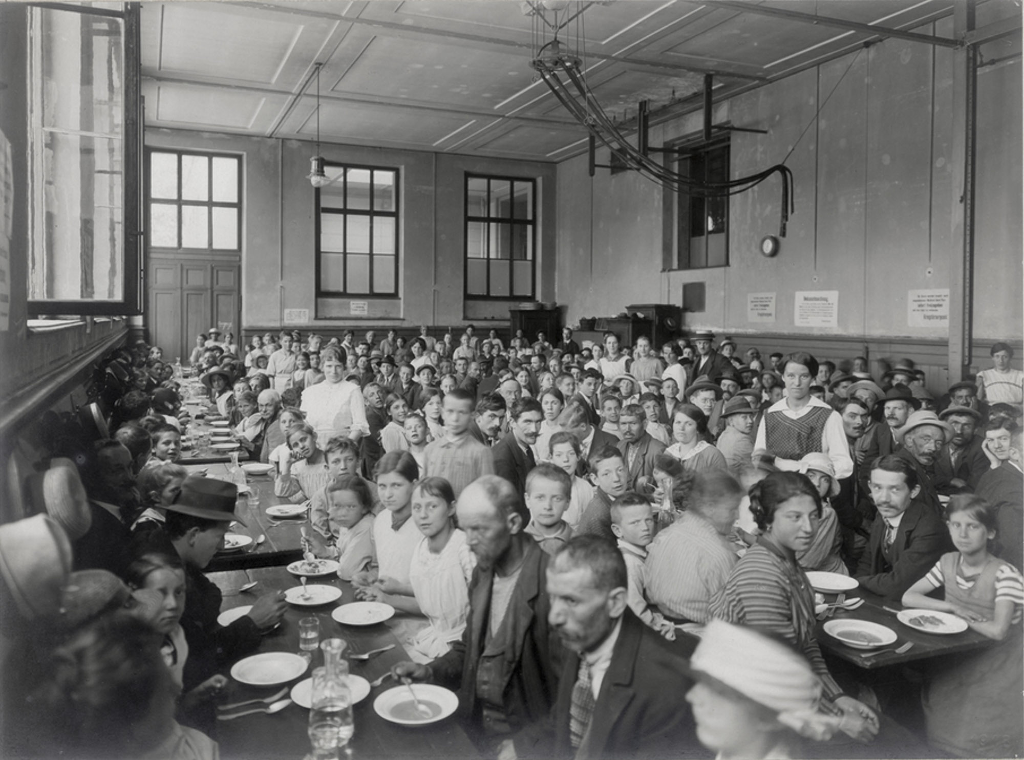 Suppenküche Drei Rosen in Basel im Jahr 1917. In der Schweiz waren Ende des Ersten Weltkriegs 700’000 Menschen auf verbilligte Abgaben von Lebensmitteln angewiesen. Foto: Carl Kling-Jenny / Staatsarchiv Basel-Stadt, BILD 13, 606.