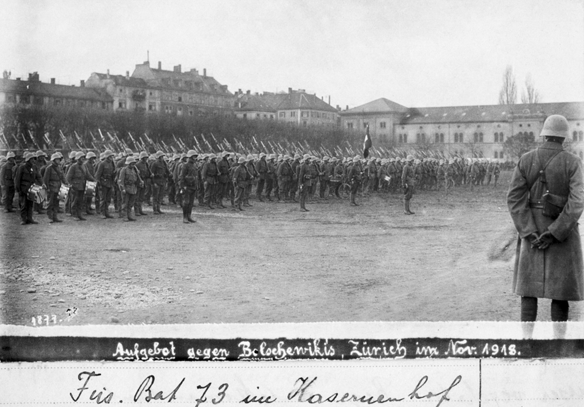 Aufmarsch eines Infanterie-Battaillons auf der Kasernenwiese mitten in der Stadt Zürich. Die Truppen waren mit Handgranaten und Maschinengewehren bewaffnet und hatten von der Militärspitze einen Schiessbefehl. Gretlers Panoptikum zur Sozialgeschichte.