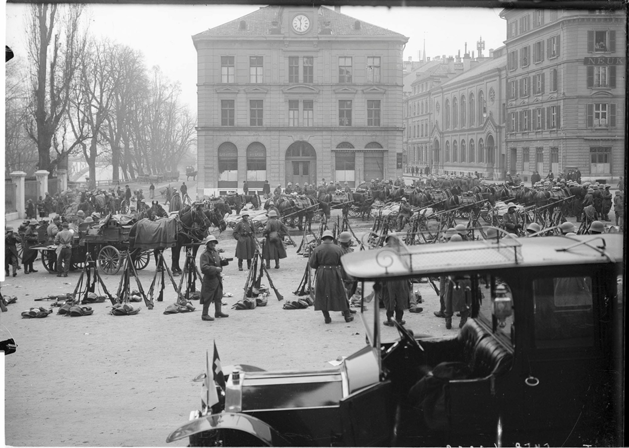 In den Städten setzte die Armee Truppen aus ländlichen Kantonen ein, weil diese keine Verwandten unter den Streikenden hatten. Das Originalbild vom Waisenhausplatz in Bern ist ein 13x18 cm Glasplatten-Negativ. Schweizerisches Bundesarchiv.
