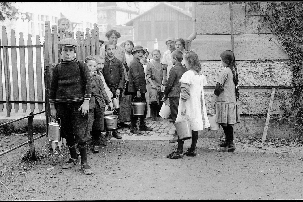 Kinder stehen beim Kern-Schulhaus in Zürich-Aussersihl für eine warme Suppe an. Um 1917. Foto: Gallas / Gretlers Panoptikum zur Sozialgeschichte.